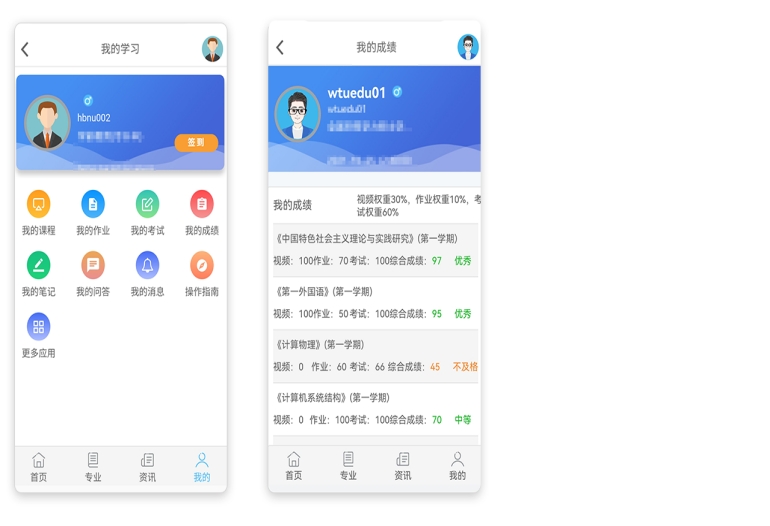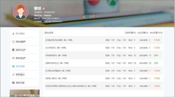 学生在“太阳网集团tyc8722高等学历继续教育学习平台(良师)”平台进行学习和考试,课程总评成绩=期末考试成绩×50%+平时成绩×50%,课程总评成绩一般按百分制计算。部分课程的平时成绩如有直播课或实验实训,则计算方法为网课30%或40%、直播课10%、实验实训10%;若课程无直播课和实验实训,则网课成绩为50%。网课学习达到90%以上才能够参加考试。