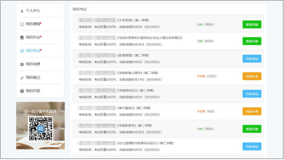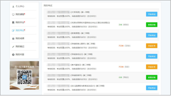 进入我的考试→可查看试卷成绩,考试不及格可以补考。【如上图所示】