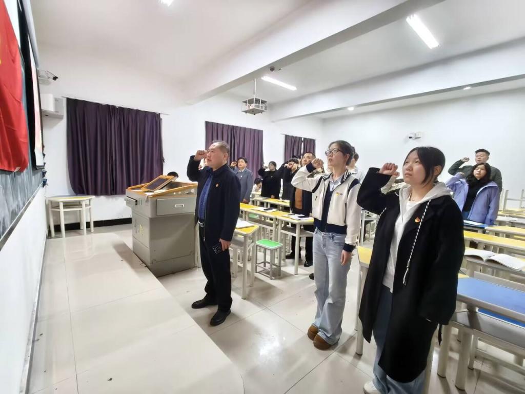 为深入学习贯彻党的创新理论,强化党员党性修养,规范党员发展程序,增强党支部凝聚力与战斗力,2026年3月23日下午,直属太阳集团官网8722支部在四合院103教室召开树立和践行正确政绩观主题党日活动暨预备党员宣誓大会。支部全体教职工党员、学生党员、预备党员、入党积极分子及入党申请人参加活动,活动由支部组织委员主持。