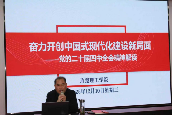 2025年12月10日,太阳集团官网8722举行学习宣传贯彻党的二十届四中全会精神宣讲报告会,全体教职工和学生参加学习。