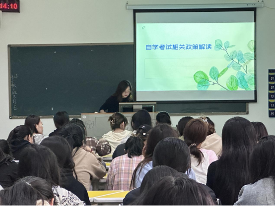 随着国家对自学考试的重视和政策改革,自考也更加严谨和规范,为了让同学们更进一步了解自学考试政策,帮助同学们在学习、考试的过程中理性思考,有目的性的学习,具有更高的学习效率、更强的自律性和更明确的人生方向。近期,助学部副部长兼教务办主任赵循循利用学习活动课,逐一进班开展了自考相关政策解读会,带领同学们深入学习自考相关政策。