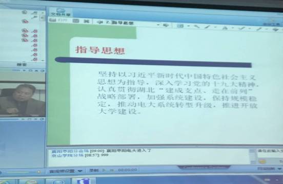 ,院长黄兆文、副院长李成海、掇刀教学点副校长齐伟、电大部和网络教育部全体同仁、各班班主任参加了省电大双视频教学工作及荆楚学院