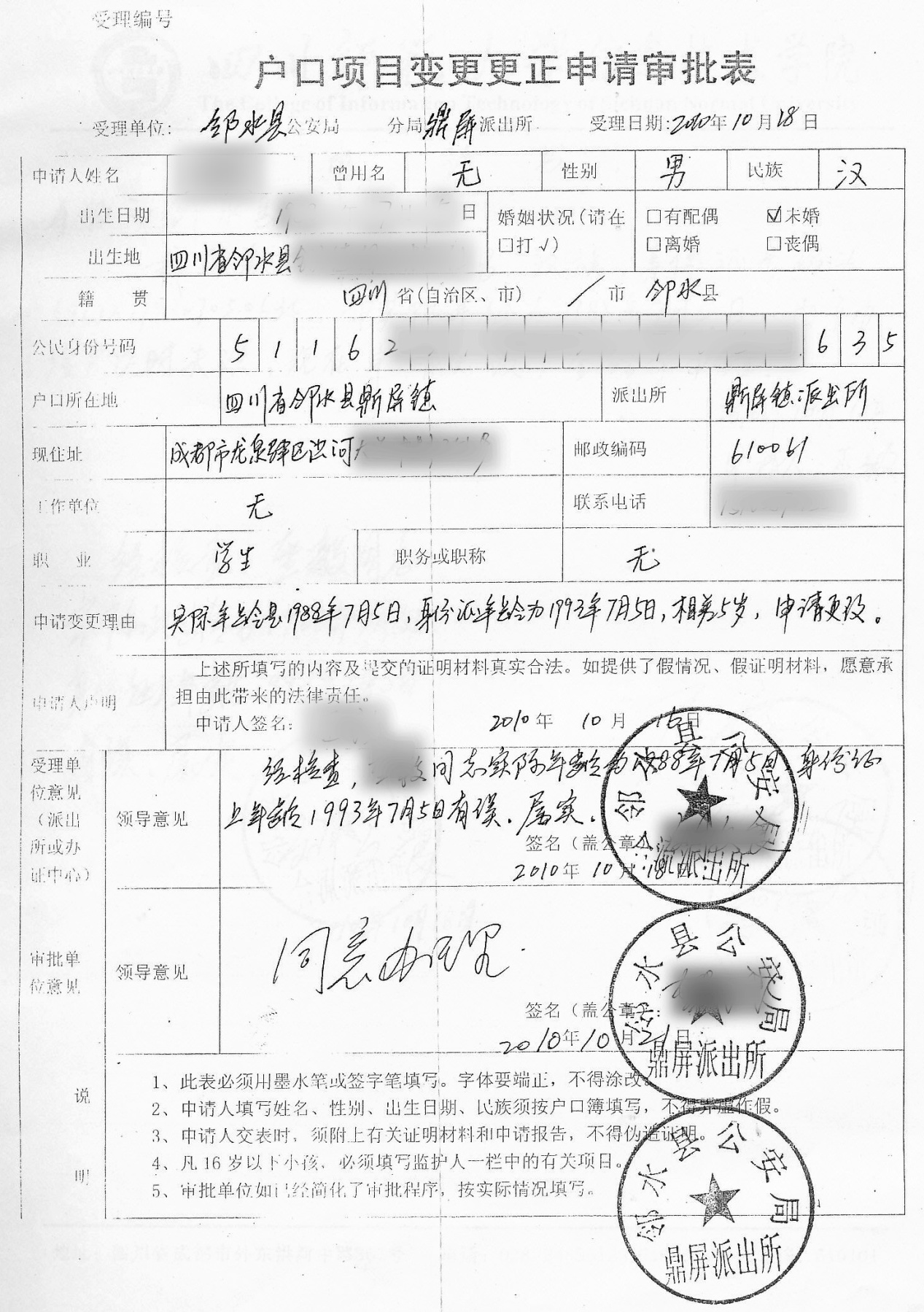 重要提醒:(1)当前学期报名的新生如果在报读高校入学测试截止前发现信息错误,请学习中心直接发送信息修改申请表扫描件到学务邮箱申请修改。(2)除只在毕业前受理信息修改的高校外,其他高校学生信息错误请及时提交信息修改材料申请修改,能否修改以高校批复为准。此表同样适用于预毕业生信息修改,预毕业生信息核对及修改事宜详见当学期发布的毕业预审通知。(3)双重户籍导致的信息变更不受理,姓名与身份证号同时变更不受理。(4)申请修改一学历信息,发送申请材料扫描件到学务邮箱申请修改即可,不需提交纸质材料。 |